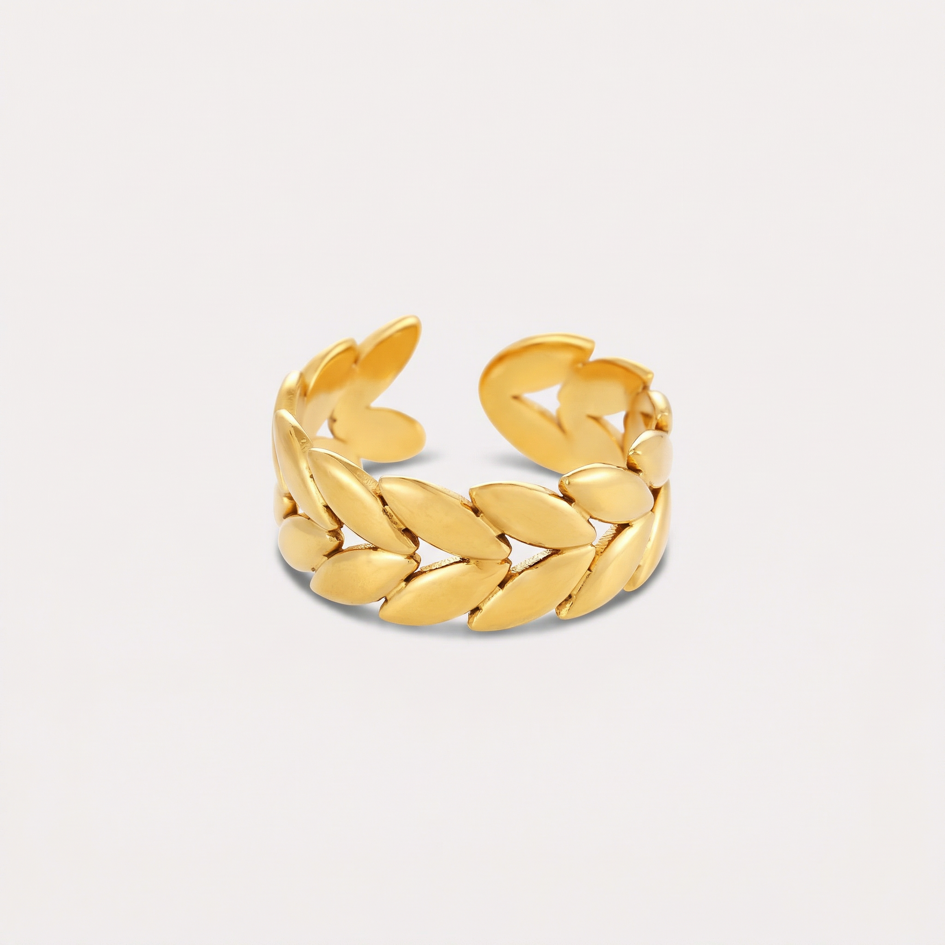 Crafted from premium stainless steel and dipped in 18K gold, the organic geometric design features graceful wheat stalks that symbolize growth and abundance. The adjustable opening ensures a perfect fit, making this piece ideal for anyone who appreciates botanical elegance with a contemporary edge.